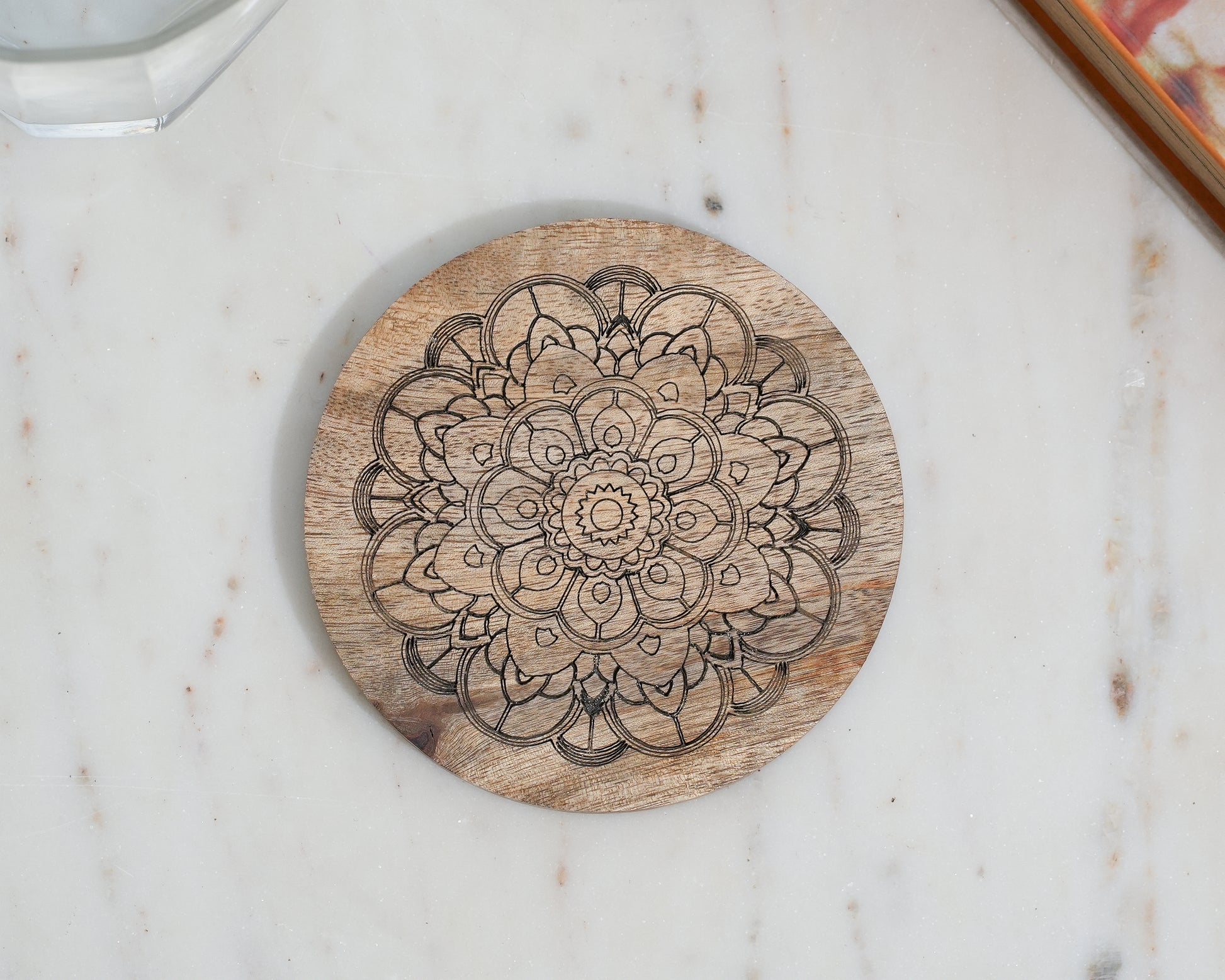 Bring an element of calm and elegance to your table with this intricately engraved wooden mandala coaster. Handcrafted from premium-quality natural wood, its circular shape and laser-etched mandala pattern evoke balance, mindfulness, and artistry. Whether placed under your daily cup of chai or styled as part of your home decor, this coaster effortlessly combines function with spiritual beauty. A timeless accessory for those who appreciate handmade charm and conscious living.