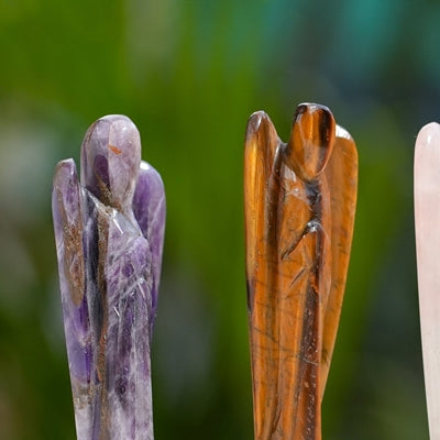 This set of four hand-carved angel figurines, made from different types of stone, represents peace, love, and spiritual protection. Each angel is intricately carved to showcase detailed wings and a serene form, symbolizing divine presence and guidance. The figurines come in Amethyst, Tiger's Eye, Rose Quartz, and Jasper stones, each carrying its own unique healing properties. Whether displayed individually or as a set, these angels will bring a sense of calm, harmony, and positive energy to any space.