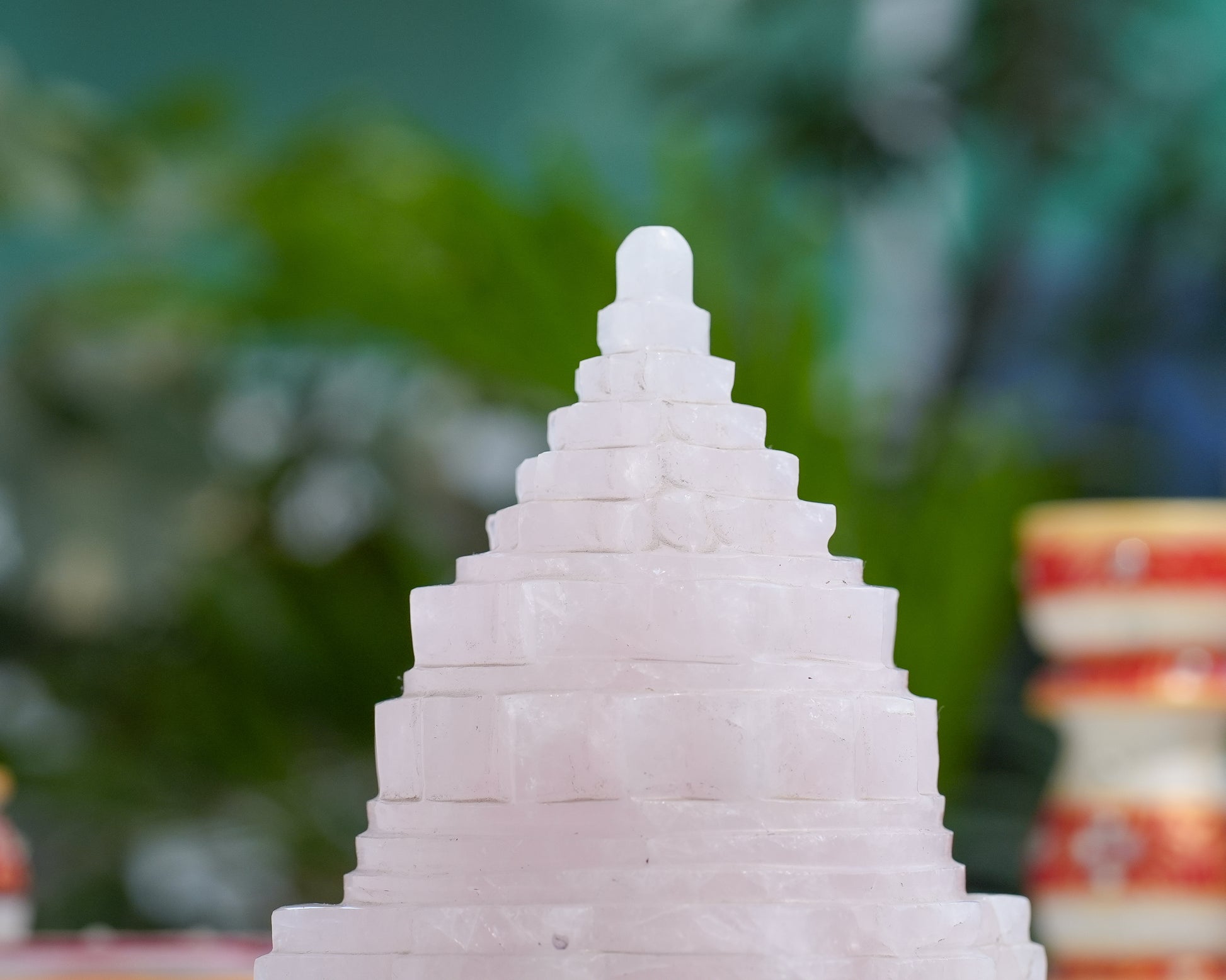 Enhance your spiritual space with this beautifully hand-carved Shree Yantra made from natural rose quartz crystal. Crafted in the sacred Meru (3D pyramid) style, this yantra represents divine feminine energy, prosperity, and cosmic order. Rose quartz, known as the stone of love and emotional healing, amplifies the yantra's vibrations of peace, compassion, and harmony. Ideal for meditation, vastu correction, or gifting, this Shree Yantra blends sacred geometry with healing crystal energy.